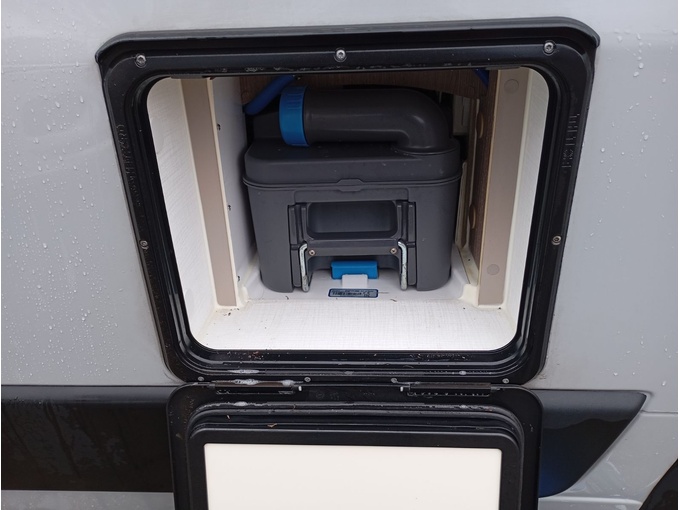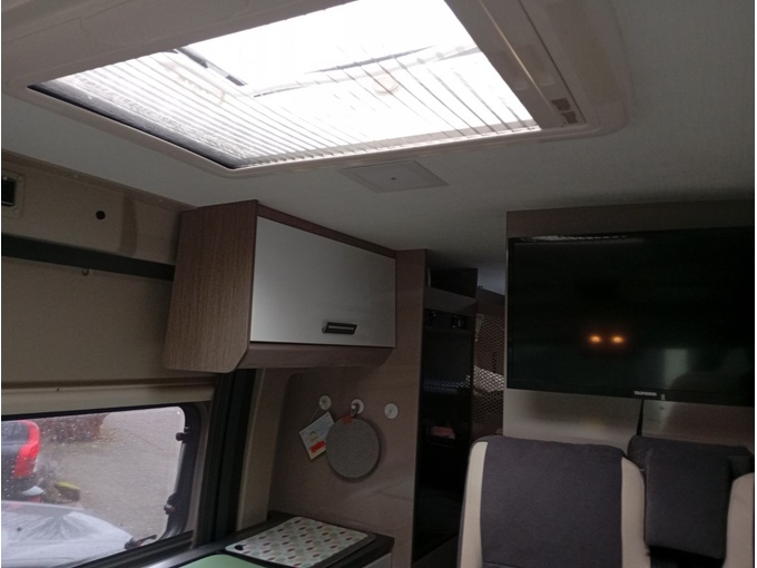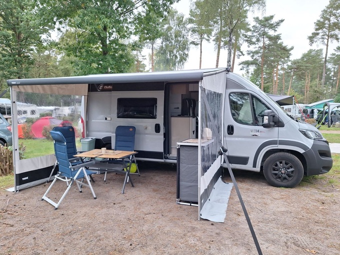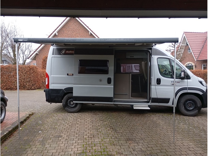 Leichte Delle überhalb der Flügeltür hinten am Dach. Kleiner Riss in der Markise.