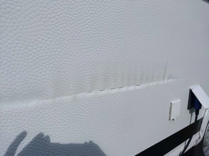 er an der linken Seite einen frischen Schaden welcher aber sehr übersichtlich ist. Der Wagen ist an einem spitzen Gegenstand vorbeigefahren und hat nun diesen "Schlitz" der aber nicht nach innen durchgeht. Man kann ihn relativ einfach oder auch aufwendiger reparieren.